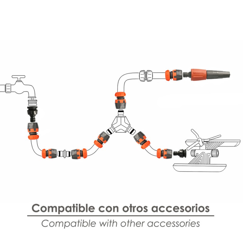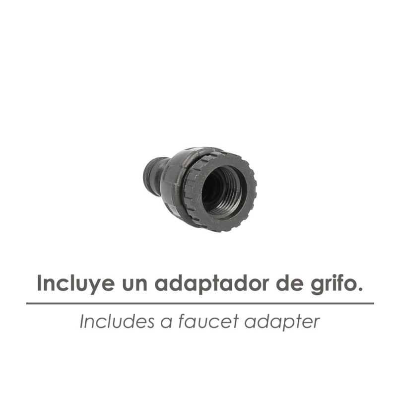 - Incluye un lanzarriegos, dos conectores de manguera 1/2" (uno con funcion stop) y un adaptador de grifo.