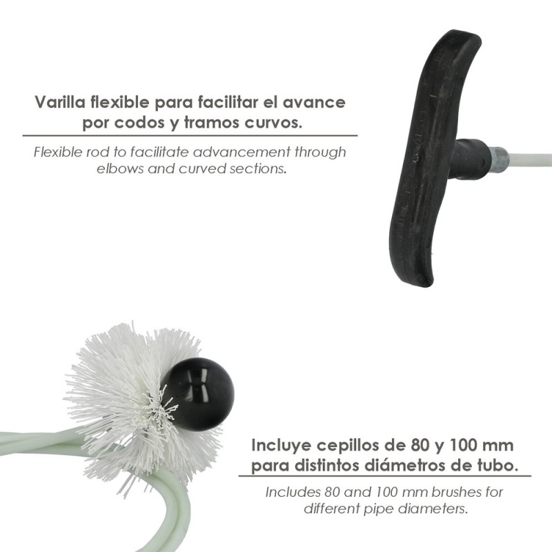 - Incluye dos cepillos de diferentes tamaños, 80 mm y 100 mm, para adaptarse a distintos diámetros de tubos, lo que lo hace versátil y fácil de usar en una variedad de configuraciones.