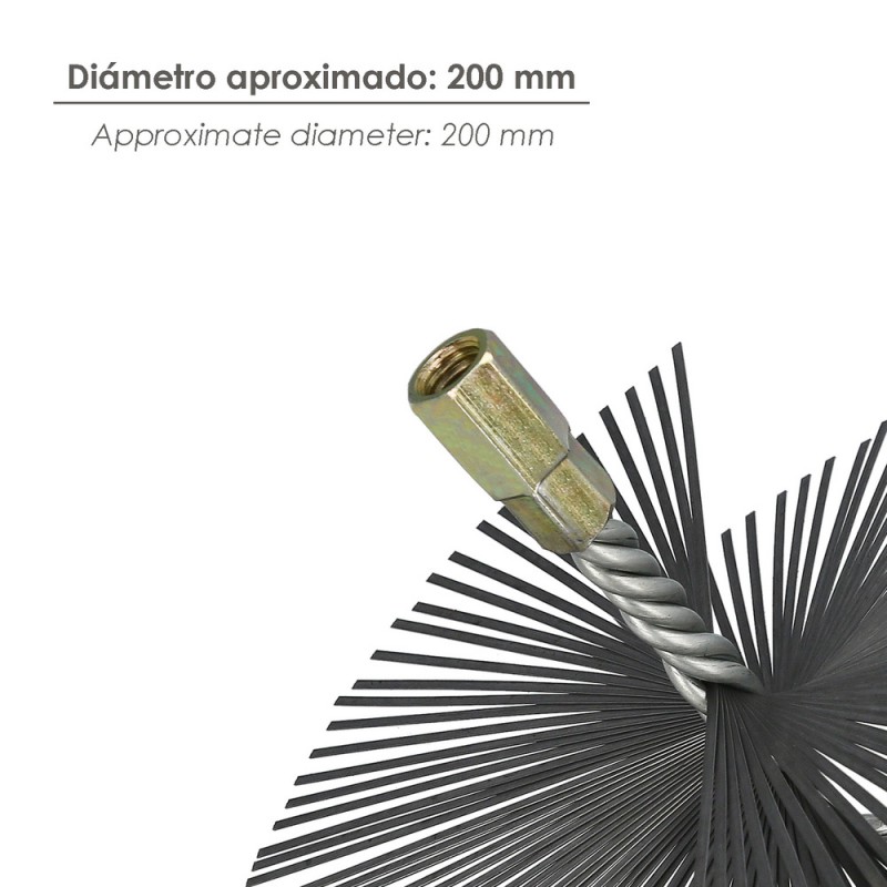 - Con un diámetro aproximado de 200 mm, este cepillo deshollinador es compatible con una variedad de kits para estufas y chimeneas, lo que lo hace versátil y práctico.