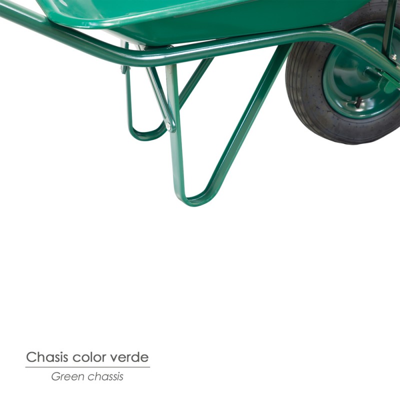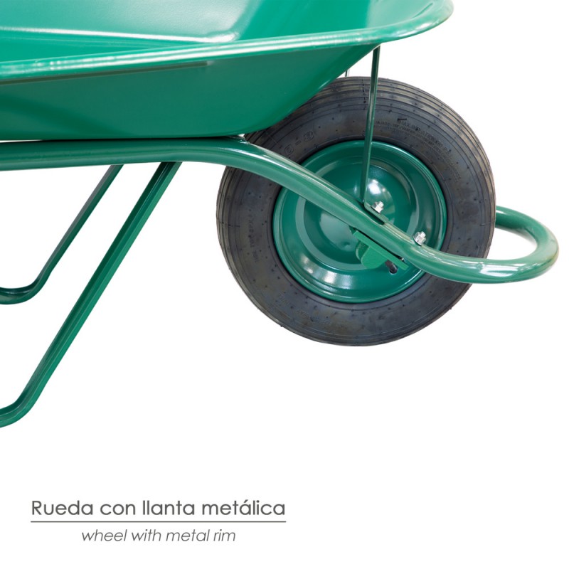 Carretilla obra verde metálica con rueda desmontada.