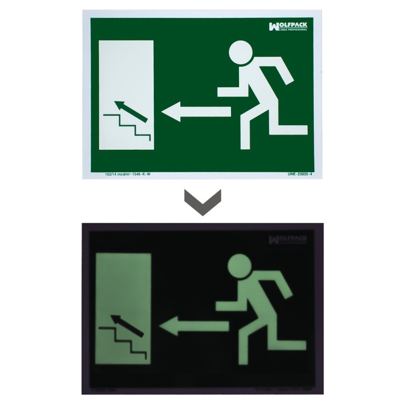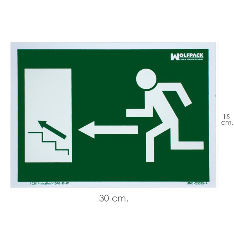 Cartel Fluorescente Salida Escalera Izquierda Arriba 30 x 21 (Alt.) cm.