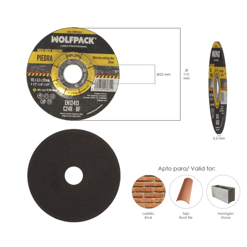 Disco Corte Abrasivo Piedra Plus Ø 115 x Ø 22 mm. Espesor 3,2 mm.